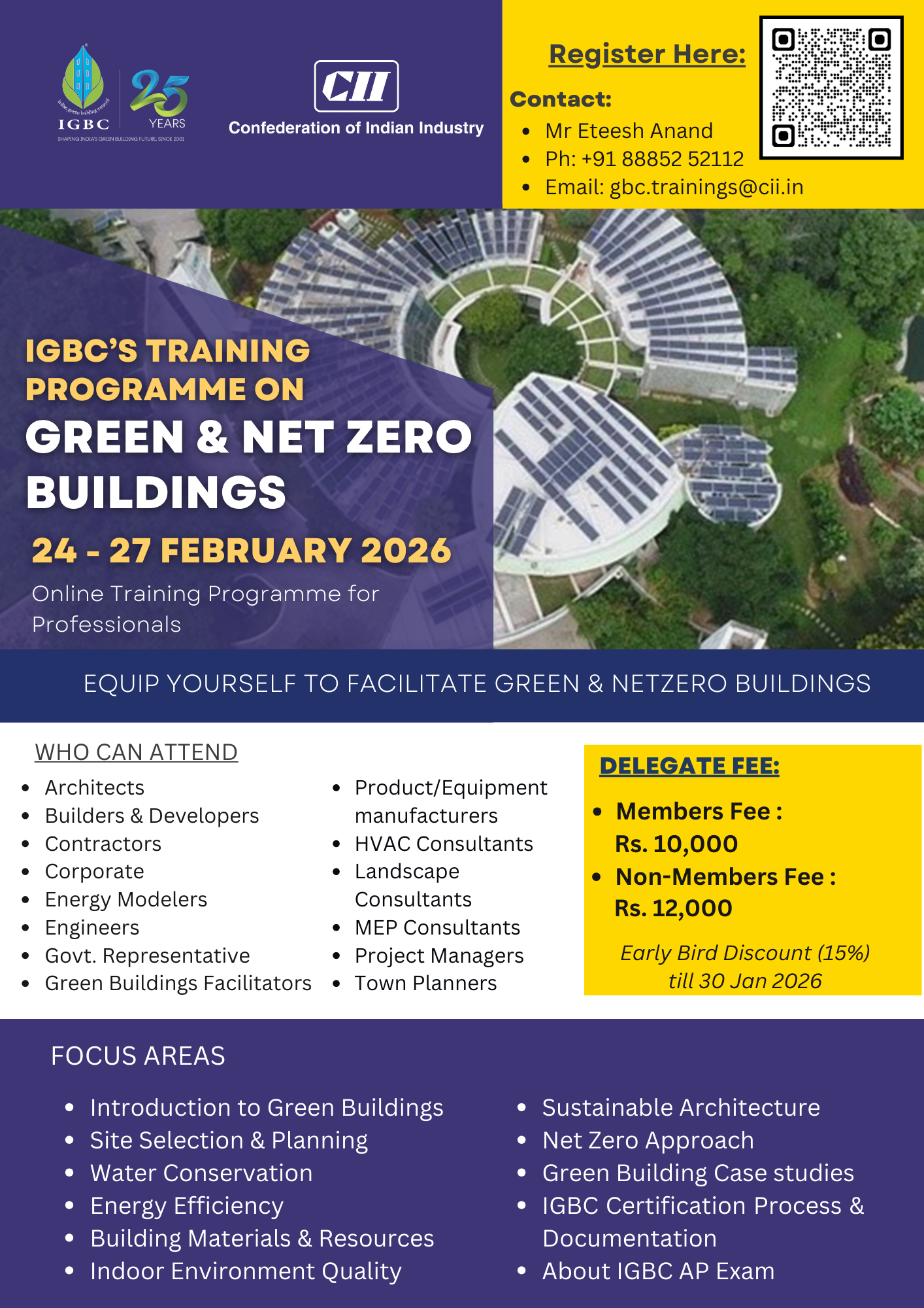 Indian Green Building Council's (IGBC) rating systems launched since 2007 had made rapid strides in the Green Building sector. These rating systems have been successfully applied in India in as many as 18,850+ buildings, till date with a footprint of 15.52 Billion sq.ft. Many Government, corporate, builders & developers in India have taken lead in constructing Green Buildings. With the growing demand for Green Buildings, there is a need to enhance the knowledge of building professionals on Green Building concepts & equip them on the Green Building rating systems.
